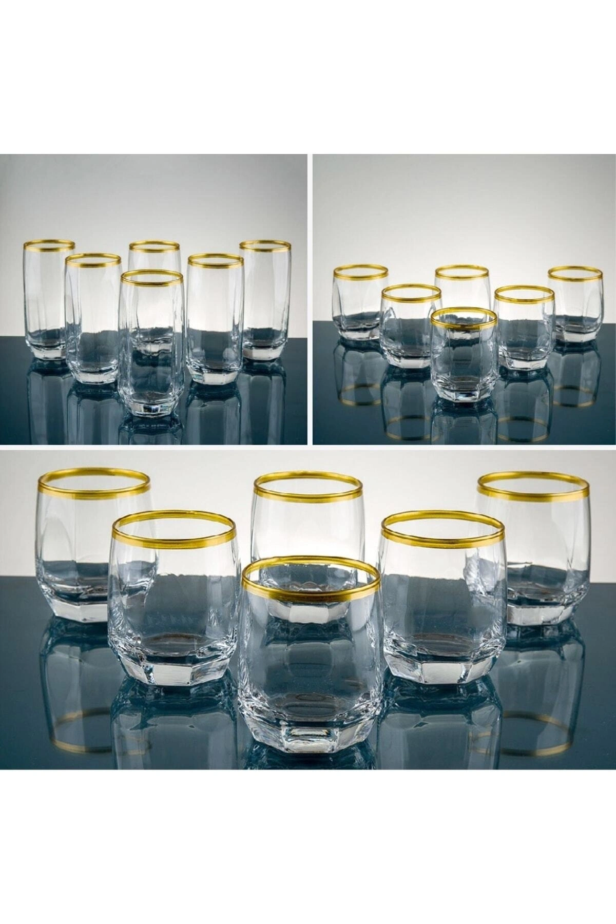 37 Parça 12 Kişilik Üççember Gold El Dekor Kesme Cam Su Bardak Takımı,Meşrubat Bardağı Seti