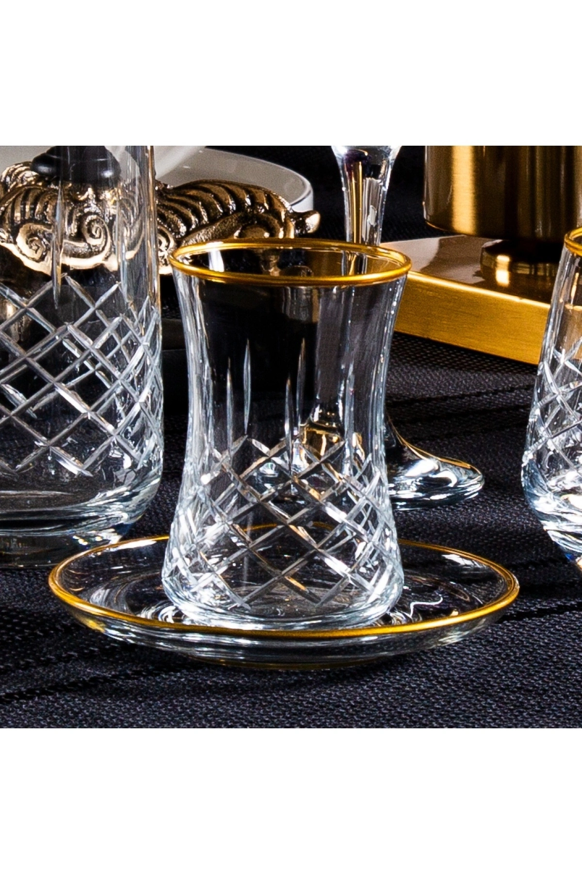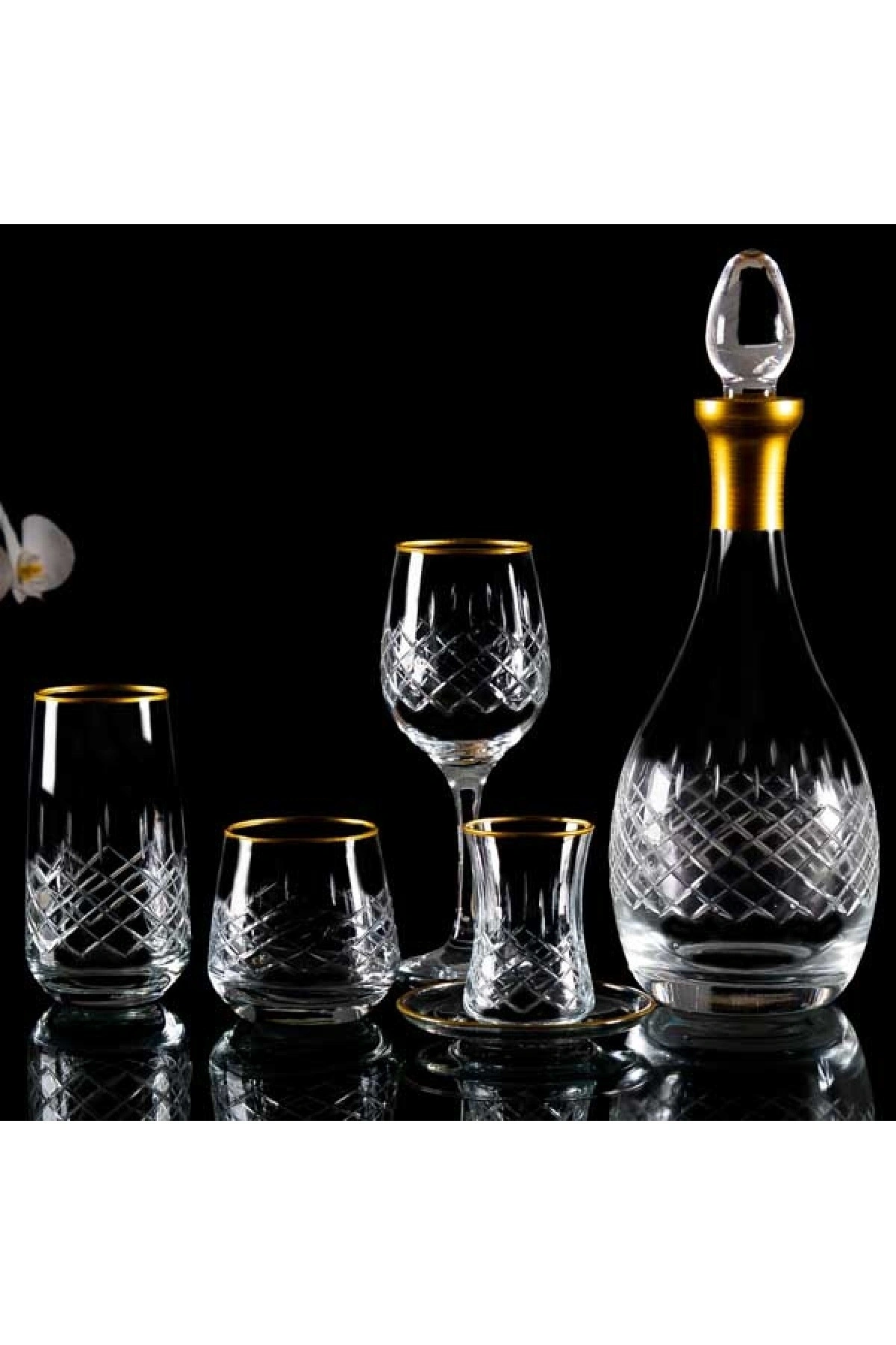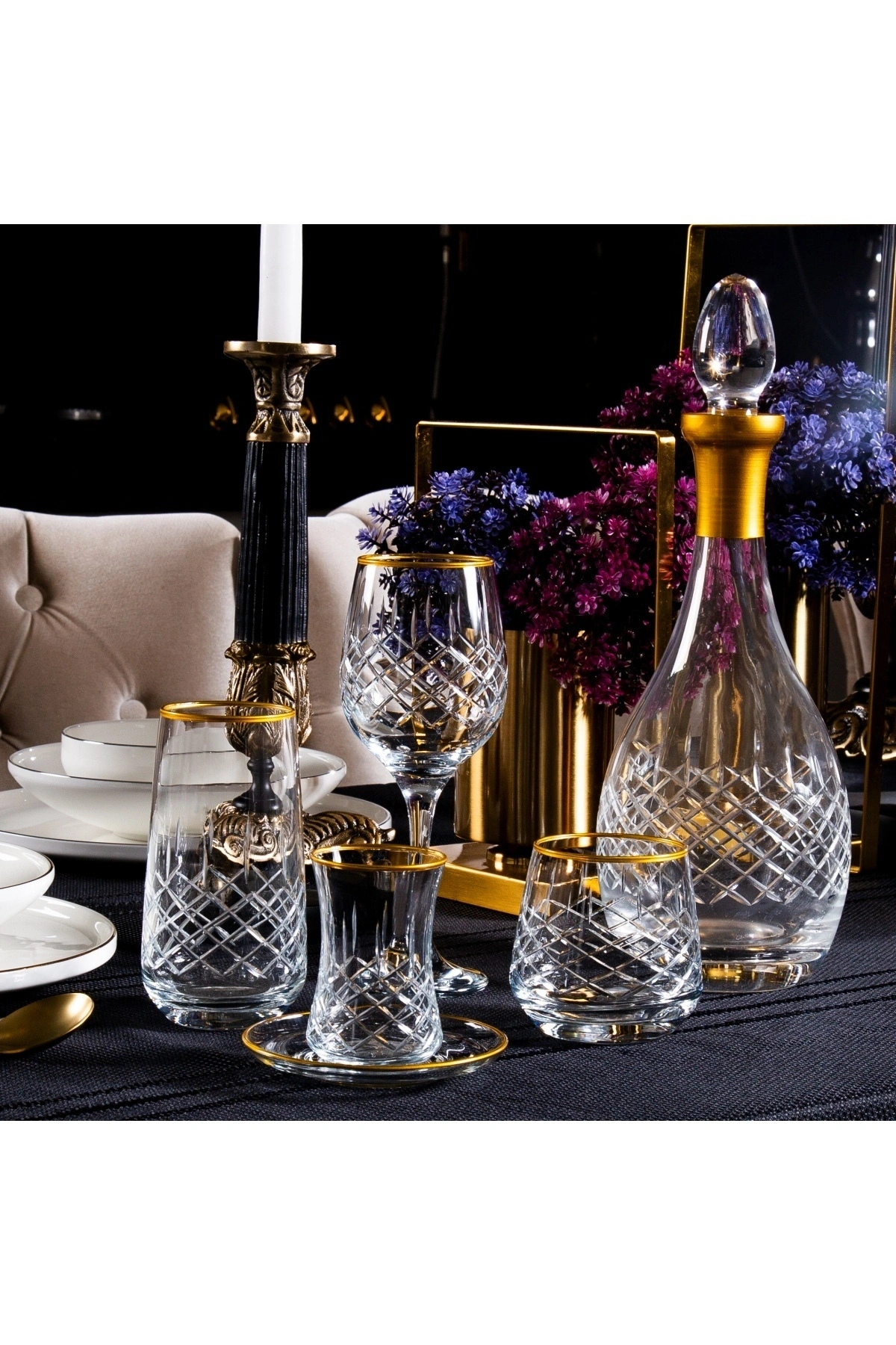 31 Parça 6 Kişilik Kareçubuk Gold El Dekor Parlatma Kesme Cam Su Takımı