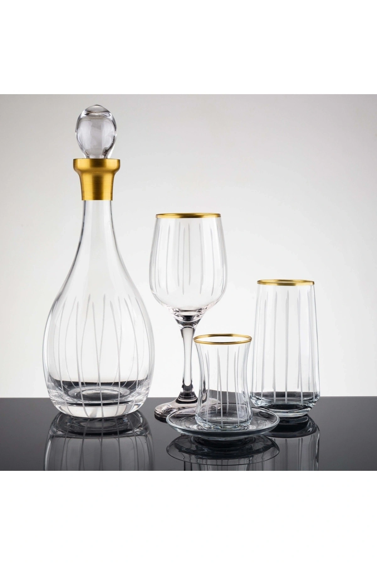 12 kişilik geniş kapasiteye sahip, her türlü davet ve toplantınızda rahatlıkla kullanabileceğiniz 49 parça su bardağı seti; Şık ve modern tasarımıyla dikkat çeken bu bardaklar, sofralarınıza zarif bir dokunuş katıyor; Yüksek kaliteli cam materyalden üretilmiş olup, dayanıklılığı ve uzun ömürlü kullanımı garanti eder; El dekor kesim detayları ile göz alıcı bir görünüm sunan bu bardaklar, her türlü sofra düzenine kolayca uyum sağlar; Altın rengi kaplama ile zenginleştirilmiş çubuk tasarım, masanızın estetiğini yükseltirken aynı zamanda şıklığıyla da ön plana çıkar;