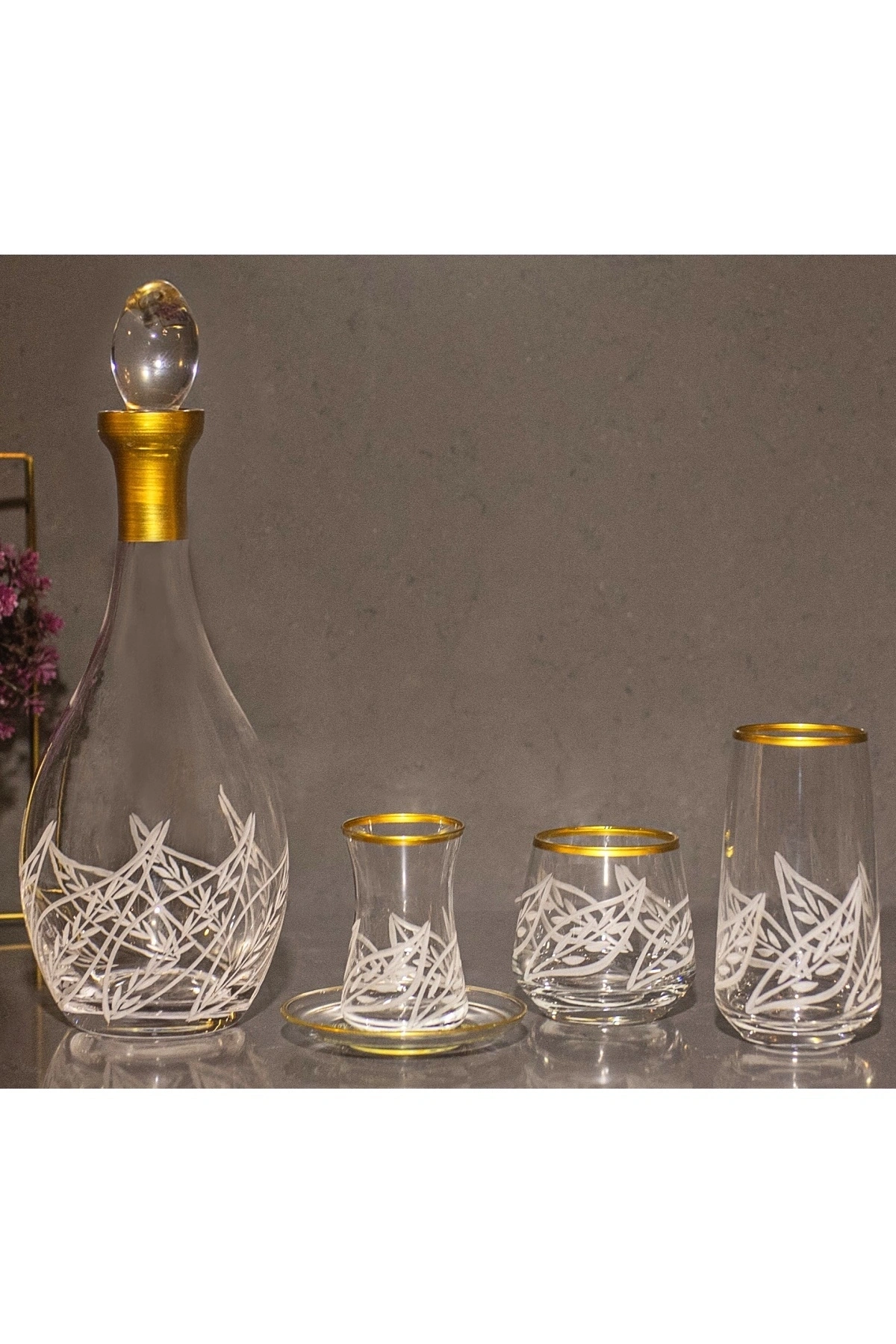 49 Parça 12 Kişilik Yaprak El Dekor Kesme Gold Cam Su Bardak Takımı,Meşrubat Bardağı Seti KARGO ESNASINDA OLUŞABİLECEK KIRIKLAR GARANTİMİZ ALTINDADIR 12 UZUN BARDAK 480cc 12 KISA MEŞRUBAT 345cc 12 ÇAY BARDAK 155cc 12 ÇAY TABAK KARAF 1,5lt Şıklığı ve zarafeti bir araya getiren kristal kesme su takımımız, sofralarınıza lüks bir dokunuş katacak.; Her detayında el işçiliği bulunan kristal kesme su takımımız, özel anlarınızı daha da unutulmaz kılacak.; Her zaman parlayan ve dikkat çeken kristal kesme su takımımız, sofralarınızın baş tacı olacak
