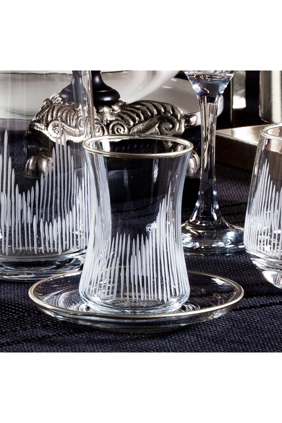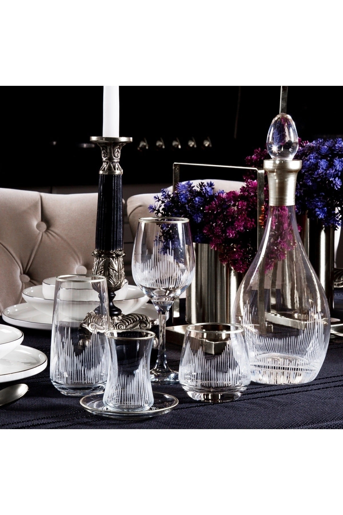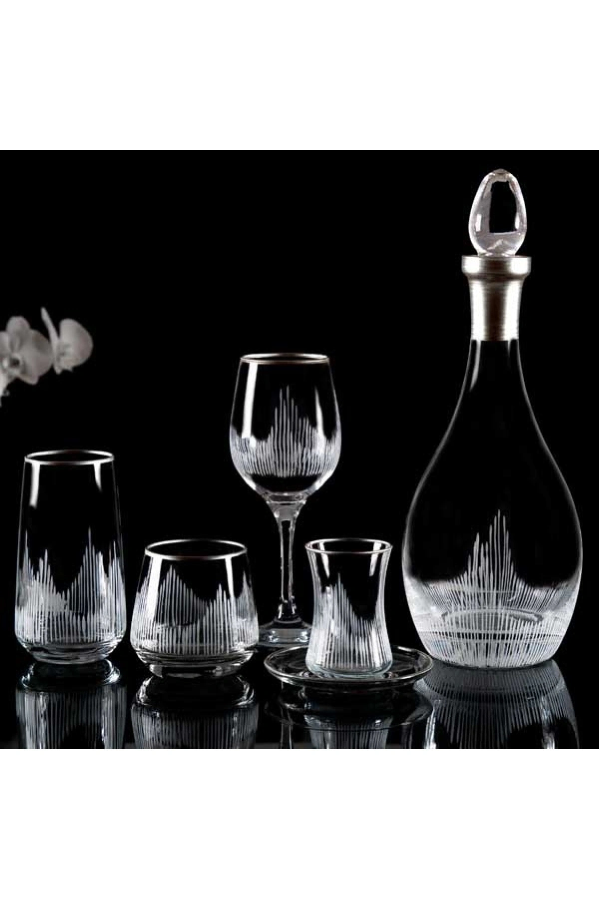 61 parça set halinde sunulan bu cam su takımı, 12 kişilik geniş kapasitesiyle misafirlerinizi ağırlamak için idealdir; Gümüş renkli alev desenleriyle şık ve modern bir görünüm sunan bu bardaklar, sofralarınıza zarif bir dokunuş katar; Yüksek kaliteli cam malzemesi sayesinde uzun ömürlü kullanım ve dayanıklılık sağlar; Su bardağı olarak tasarlanmış bu ürün, soğuk içeceklerinizi keyifle yudumlayabileceğiniz estetik bir tasarıma sahiptir;