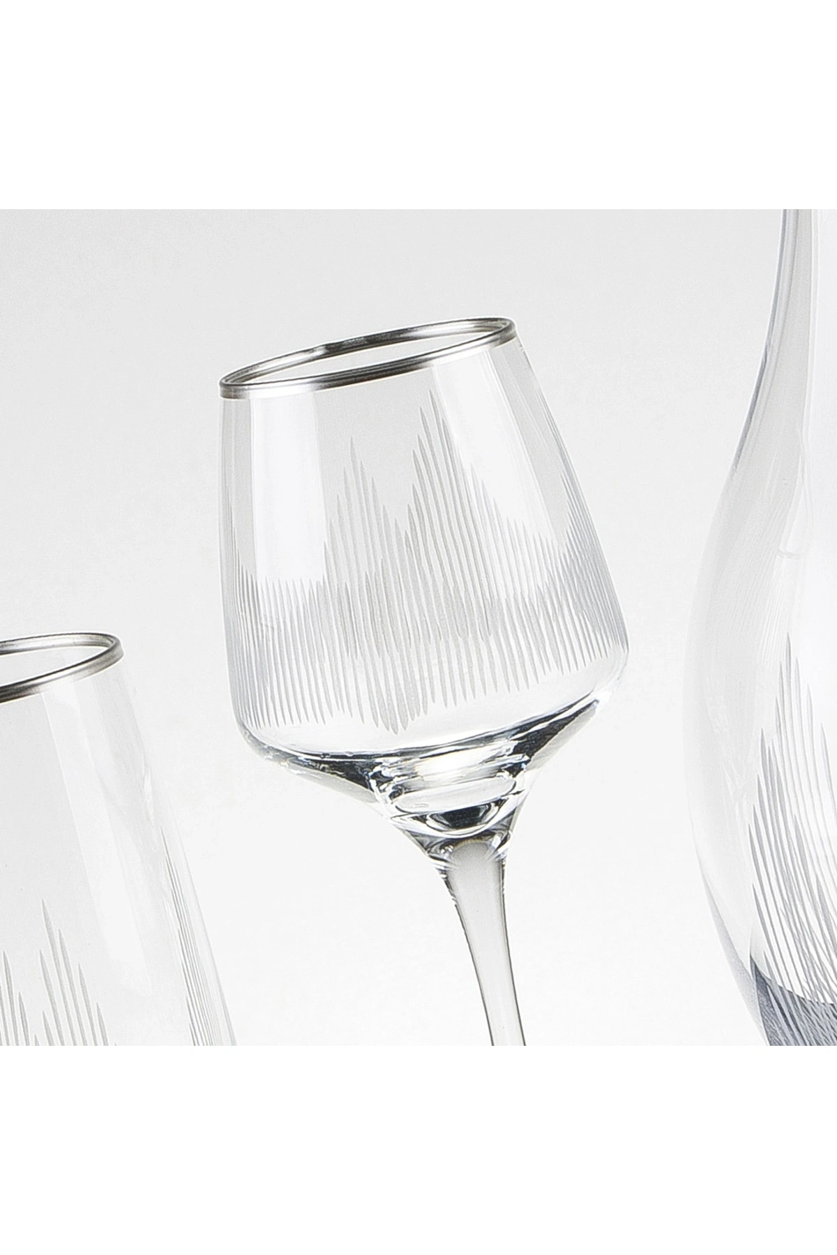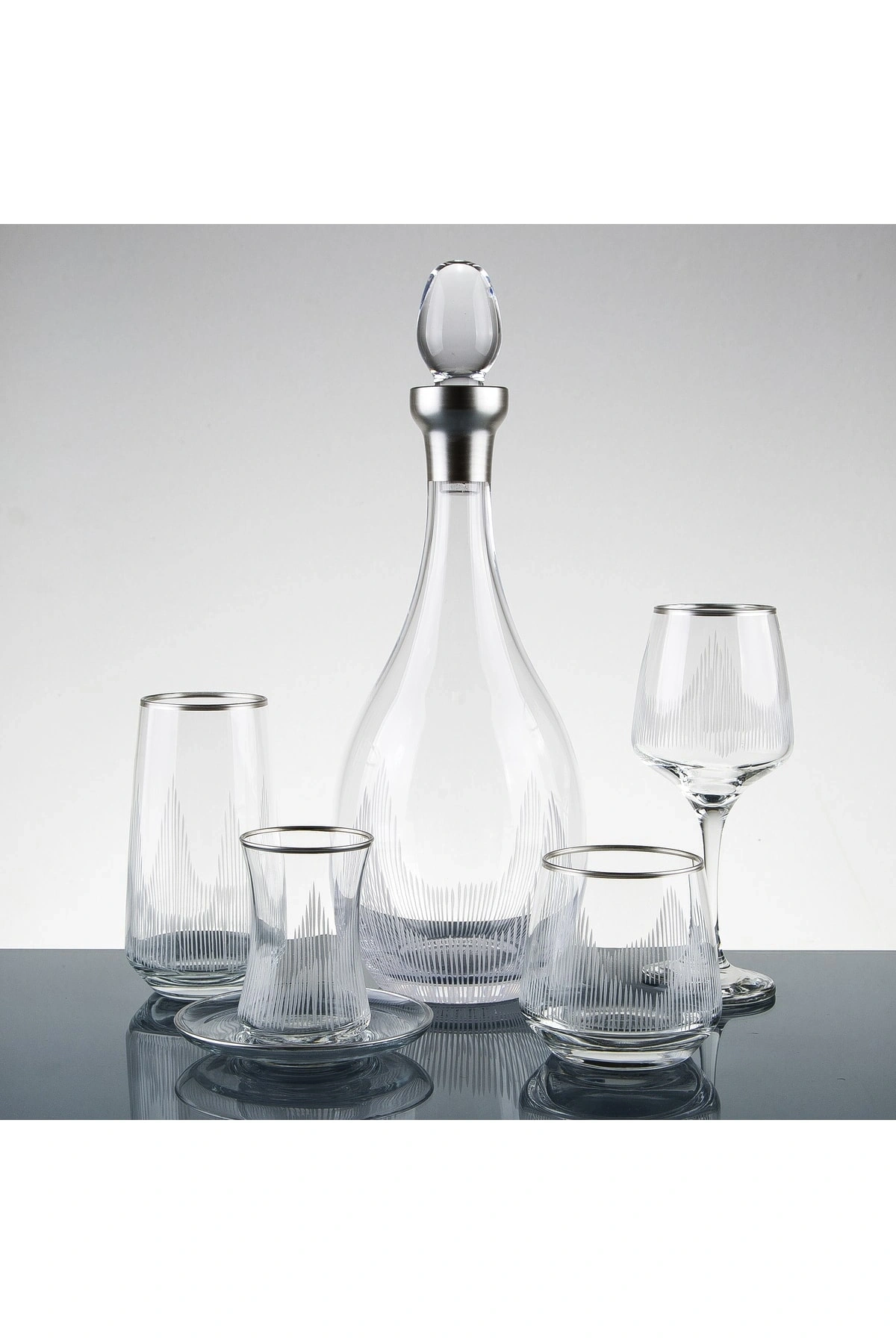 - 61 parça set halinde sunulan bu gümüş renkli su takımı, 12 kişilik misafirlerinizi ağırlamak için idealdir; - Cam malzemesi sayesinde şık ve zarif bir görünüm sunar, sofralarınıza modern bir dokunuş katar; - Su bardağı tasarımı ile suyunuzu rahatça yudumlayabileceğiniz, her türlü içeceğinizi keyifle tüketebileceğiniz bir seçenektir;