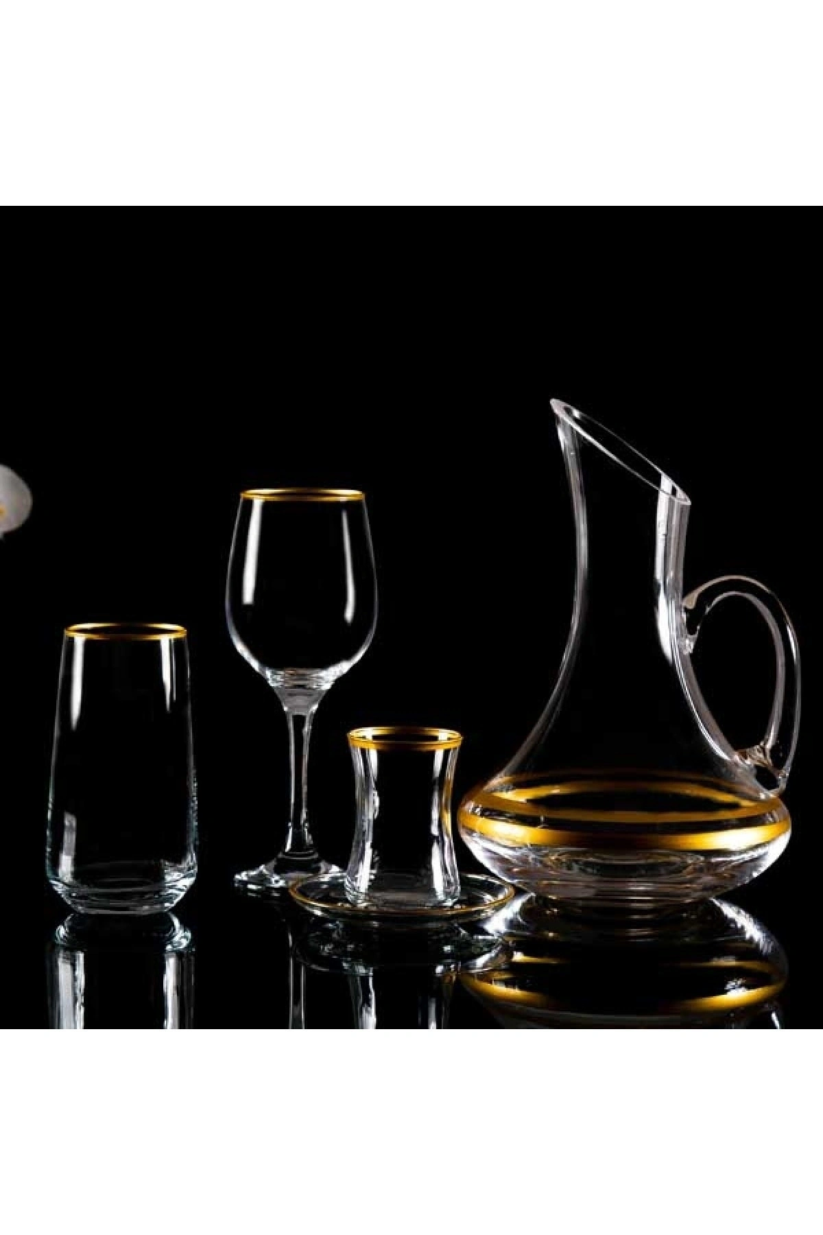 61 parça 12 kişilik gold cam su takımı, şık ve zarif tasarımıyla sofralarınıza estetik bir dokunuş katıyor; Yüksek kaliteli cam malzemesi sayesinde uzun ömürlü kullanım sunar ve dayanıklılığı ile ön plana çıkar; Su bardağı olarak tasarlanmış bu set, günlük kullanım için idealdir ve her türlü içeceğinizi rahatlıkla servis etmenize olanak tanır; Altın rengi detaylarıyla göz alıcı bir görünüm sergileyen bu takım, sofra düzeninize lüks bir hava katar;