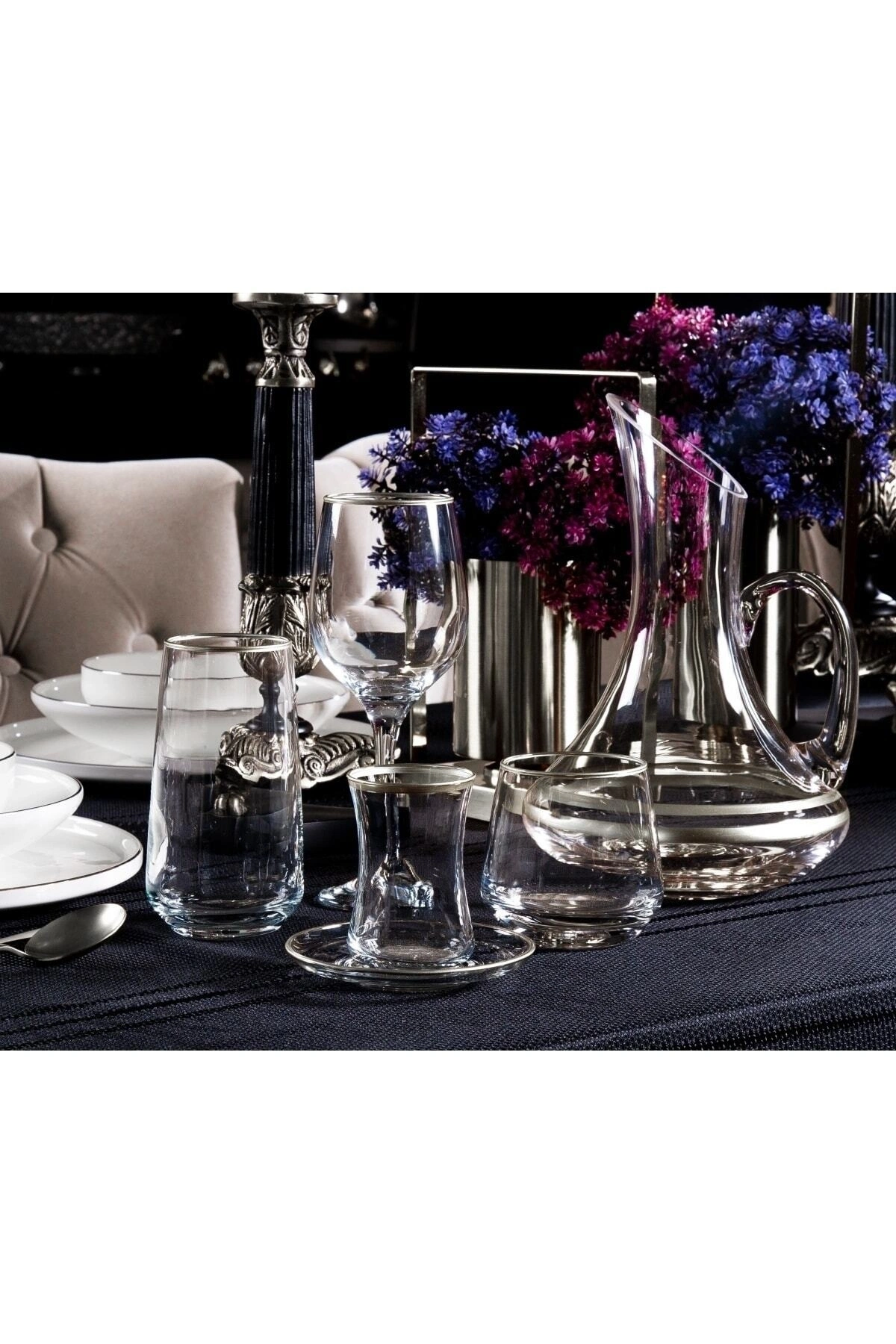 12 kişilik geniş kapasiteye sahip, her türlü davet ve toplantınızda rahatlıkla kullanabileceğiniz 61 parça gümüş cam su takımı; Şeffaf cam malzemesi sayesinde içeceklerinizi estetik bir şekilde sunar ve sofralarınıza zarif bir dokunuş katar; Dayanıklı cam yapısı ile uzun süreli kullanım imkanı sağlar ve sık kullanımlarda bile formunu korur; Gümüş rengi ile modern ve şık bir görünüm sunarak sofra düzeninize sofistike bir hava katar;