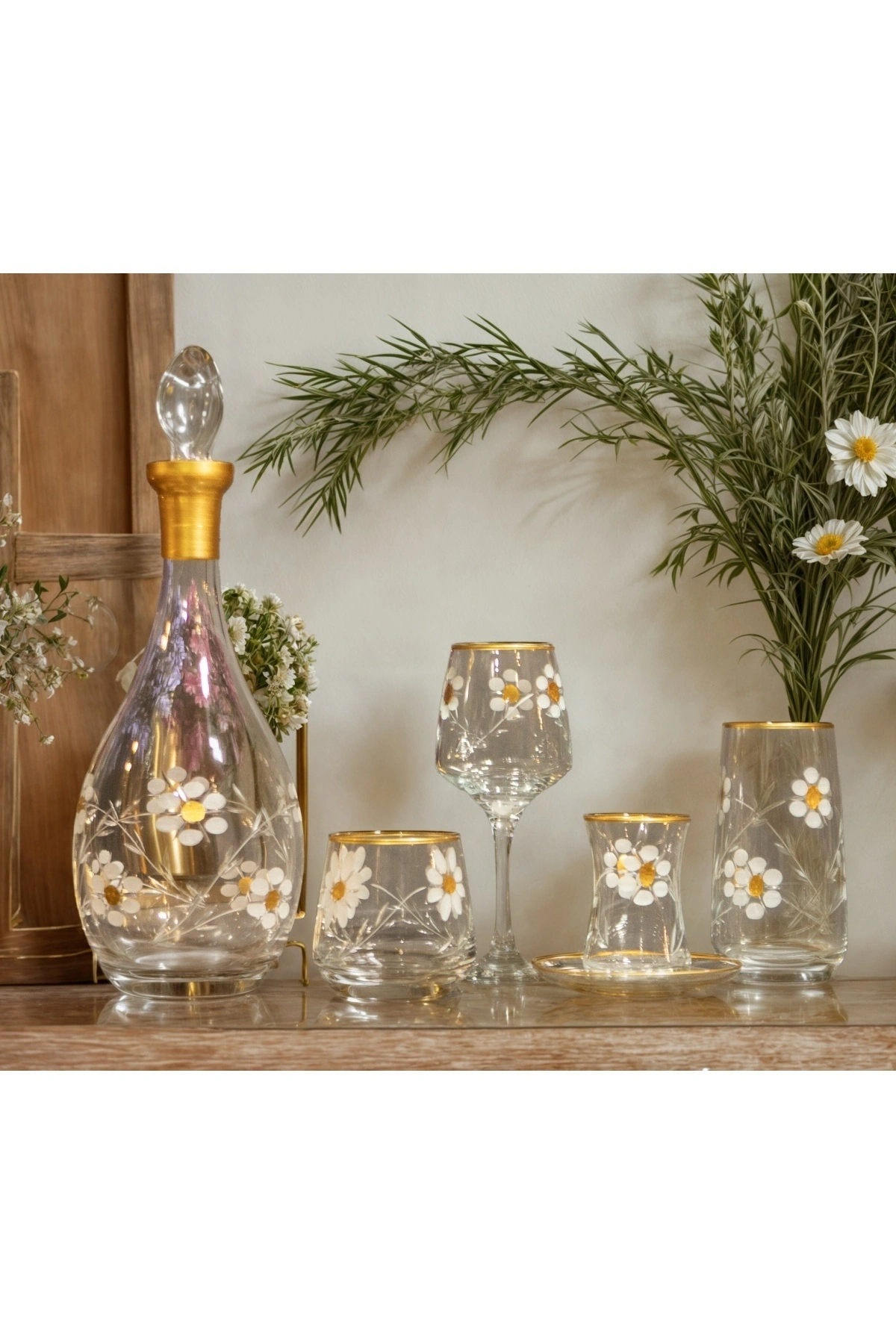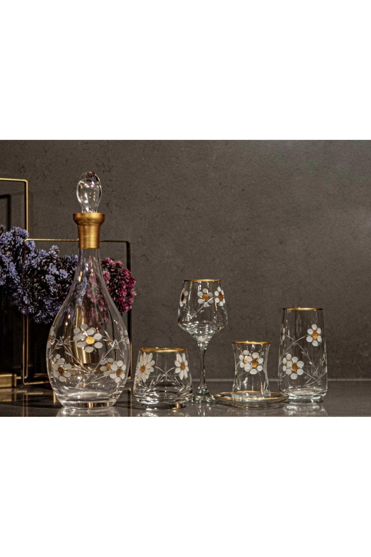 - 12 kişilik geniş kapasiteye sahip, her türlü özel davet ve toplantılarınız için ideal bir seçim; - Şık ve zarif tasarımıyla dikkat çeken papatya el dekor kristal kesme gold cam su takımı, sofralarınıza estetik bir dokunuş katıyor; - Yüksek kaliteli cam materyali sayesinde uzun ömürlü kullanım sunar ve dayanıklılığı ile ön plana çıkar; - Her bir bardakta detaylı papatya el dekoru ve altın rengi kristal kesim desenleri ile göz alıcı bir görünüm sağlar;