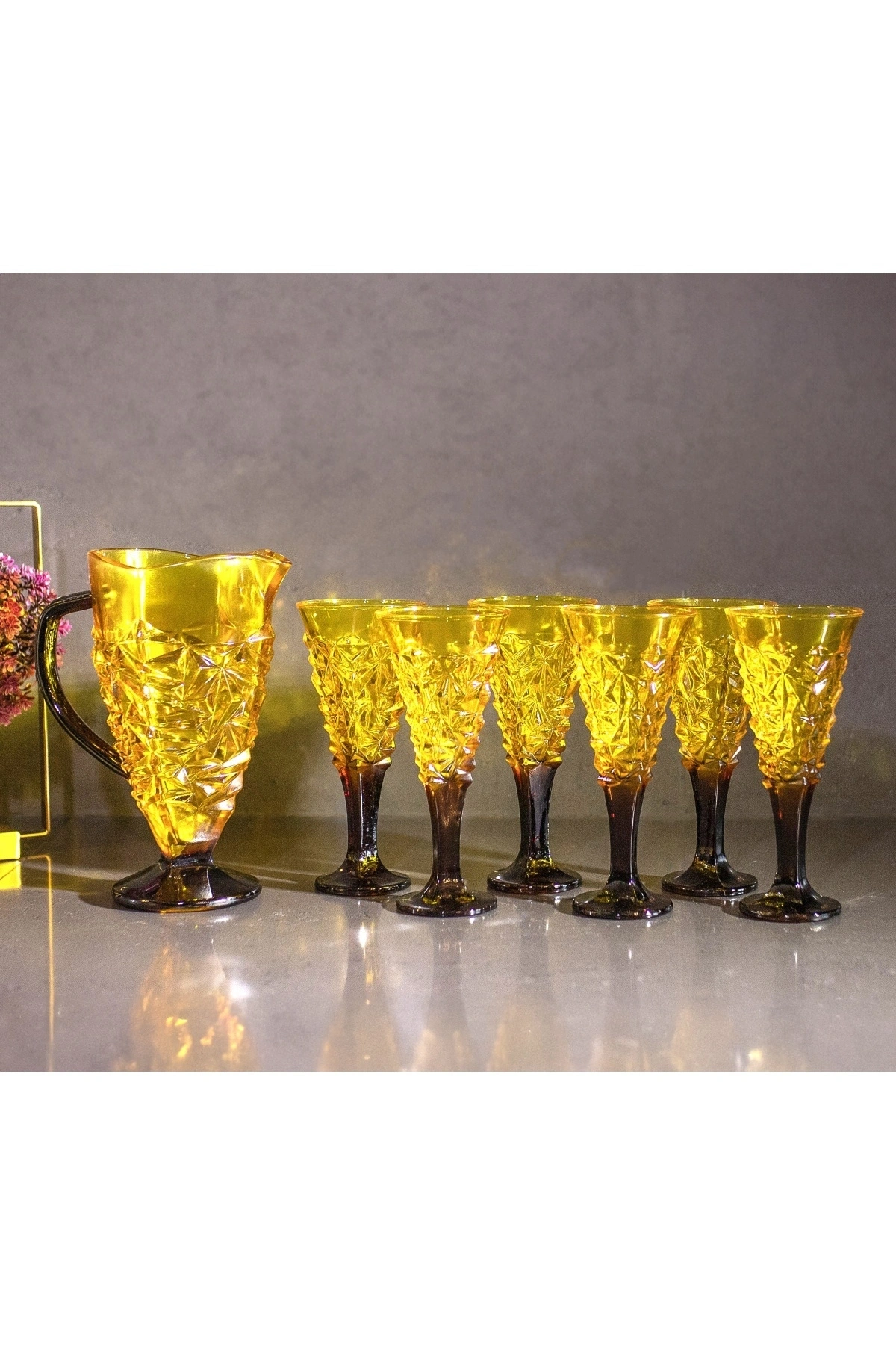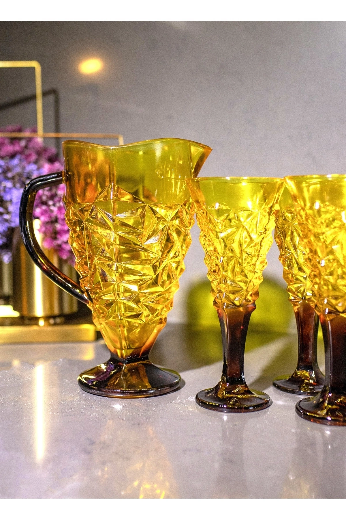 7 parça renkli cam su ve meşrubat seti, mutfakta veya ofiste şıklığı ve işlevselliği bir arada sunar; 1,5 litrelik ve 270 cc'lik boyutlarıyla farklı içecekler için idealdir; hem suyunuzu hem de meşrubatlarınızı keyifle yudumlayabilirsiniz; Sarı ve kahverengi renk seçenekleriyle estetik bir görünüm sağlar, sofralarınıza renk katar; Cam materyali sayesinde içeceklerinizin tazeliğini korurken, dayanıklılığı ile uzun süreli kullanım imkanı sunar;
